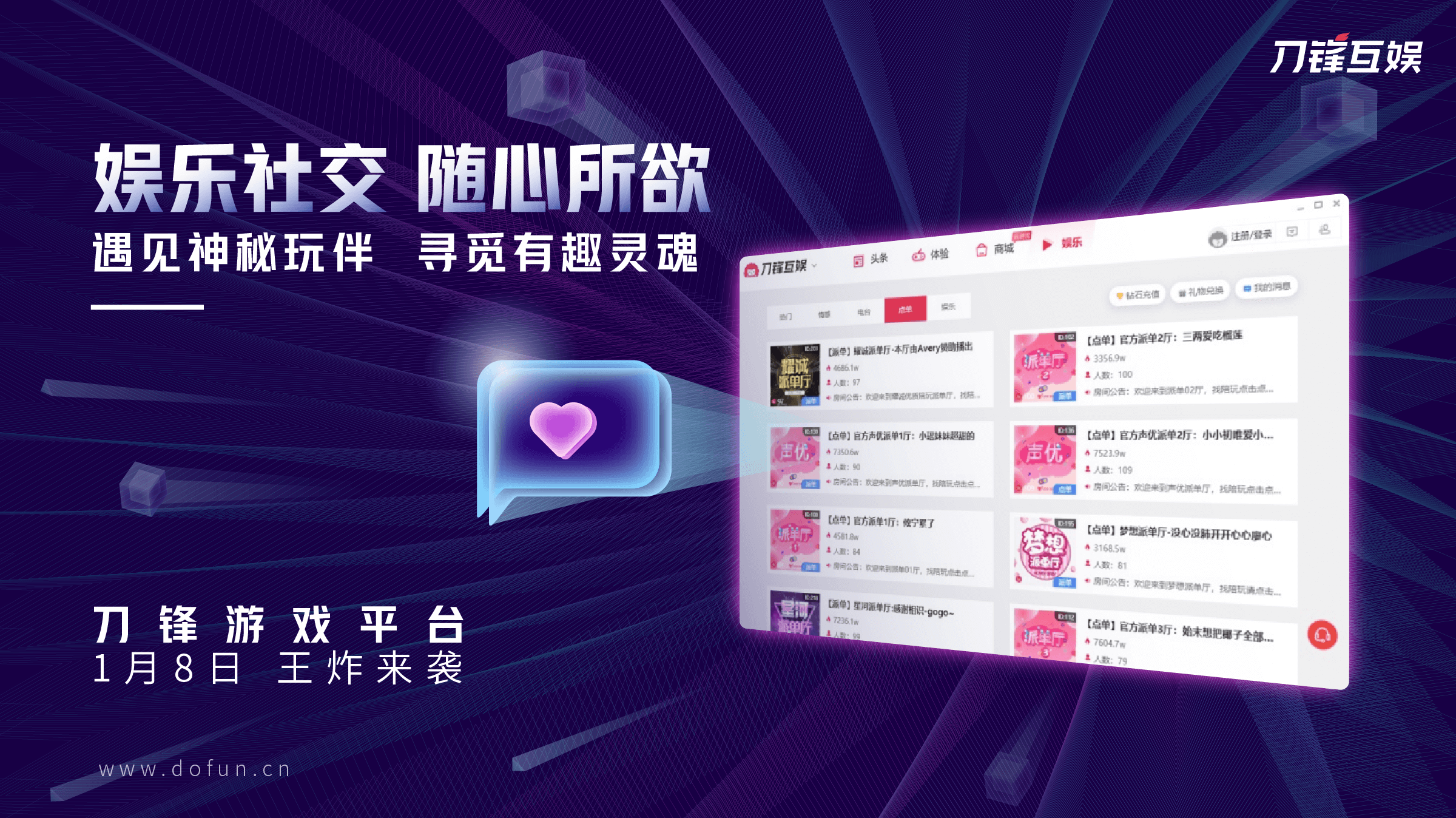 刀锋游戏平台提供的不仅仅是优质的游戏内容体验。为了满足玩家日益增长的游戏社交需求,刀锋游戏平台推出陪玩、聊天室等社交娱乐功能,随时随地约玩技术流操作大神或是心宜的颜值女神,好看的皮囊和有趣的灵魂都在这里。